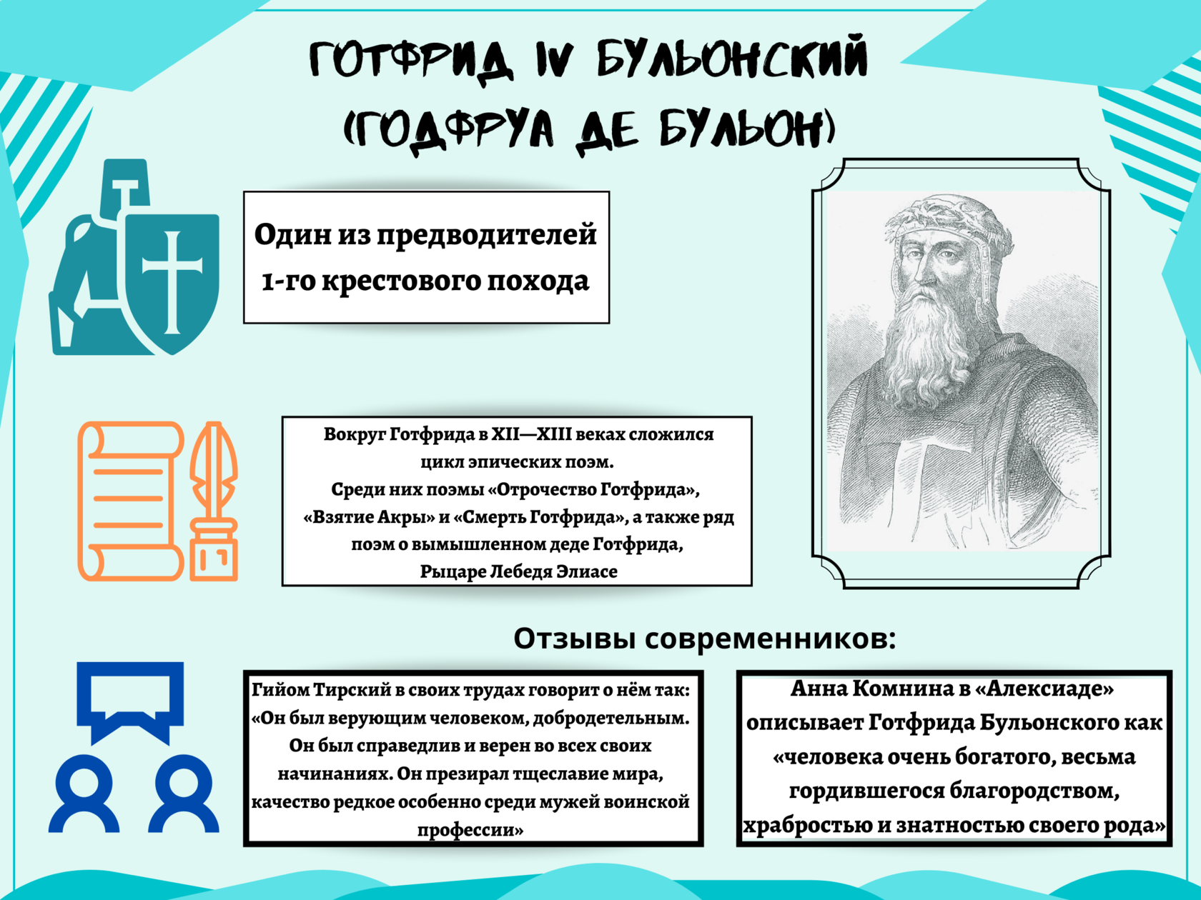 Готфрид IV Бульонский (Годфруа де Бульон) — граф Бульонский (1076—1096), герцог Нижней Лотарингии (1087—1096), сын Евстахия II, графа Булонского и Иды. Один из предводителей 1-го крестового похода 1096—1099 года на Востоке