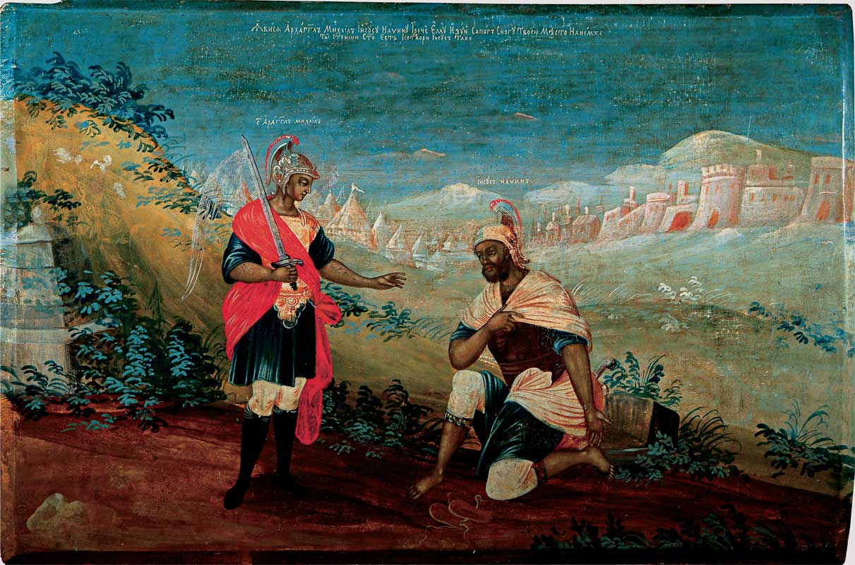 Святой Иисус Навин после смерти пророка Моисея был вождем Израильского народа. Он завоевал Обетованную землю и ввел в нее еврейский народ. Господь явил через Иисуса Навина великие чудеса. Евреи прошли через реку Иордан. Иисусу Навину являлся Архистратиг Михаил, стены города Иерихона, осажденного израильтянами, пали сами собой после того, как Ковчег Завета обносили вокруг города в течение семи дней. Наконец, во время сражения с неприятелем Иисус Навин, по велению Божию, остановил движение солнца и продлил день до того времени, пока не была одержана победа. После окончания войны Иисус Навин разделил Обетованную землю между 12-ю коленами Израильскими и скончался, заповедав народу хранить закон Моисеев. Все эти события изложены в Книге Иисуса Навина, входящей в состав Библии.